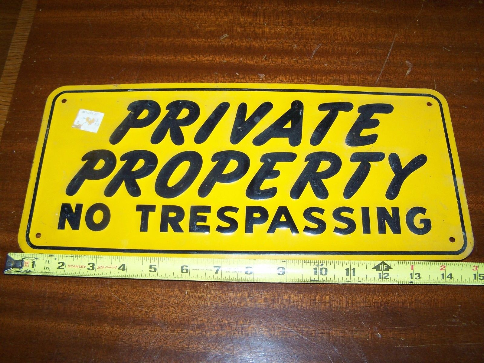 Title (ebay affiliate link): Vintage Original NO TRESPASSING PRIVATE PROPERTY Sign Metal Farm Barn Fence