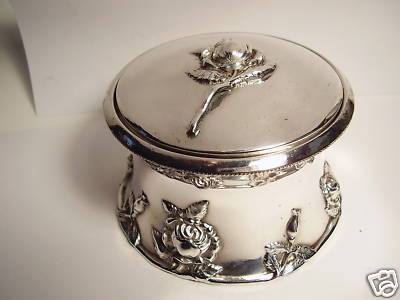 Title (ebay affiliate link): ANTIQUE VICTORIAN SILVERPLATE REPOUSE POWDER JAR