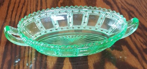 Title (ebay affiliate link): Imperial Uranium Green 6 1/2" Beaded Block 2 Handled Olive Dish Depression Glass
