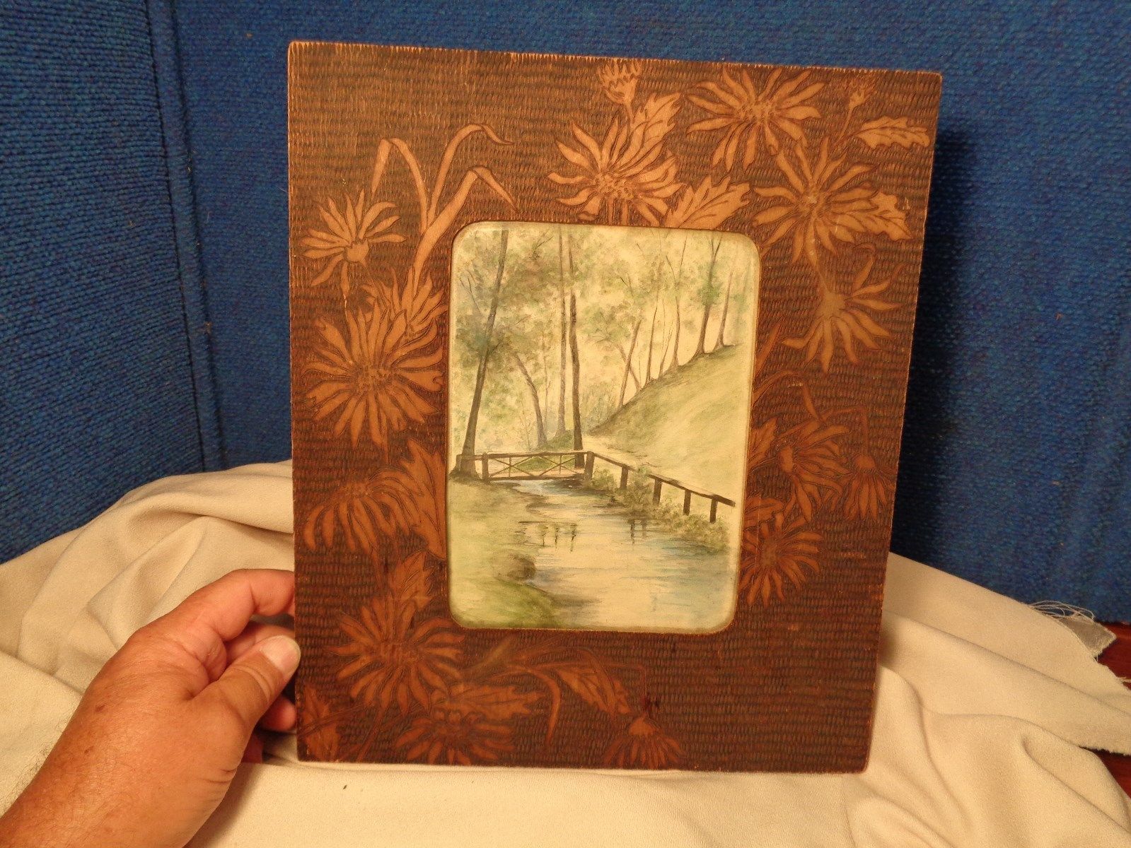 Title (ebay affiliate link): EARLY 1900''S WATERCOLOR PAINTING IN PYROGRAPHY TRAMP FOLK ART WOOD FRAME