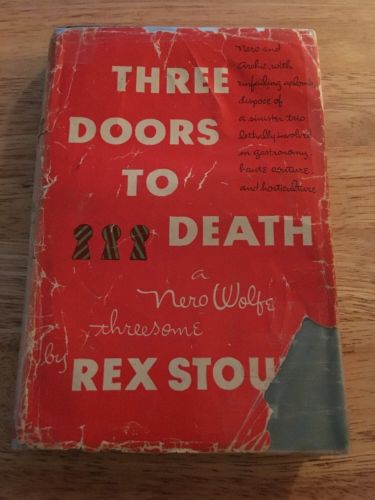 Title (ebay affiliate link): Rex Stout Nero Wolfe - Three Doors to Death - 1949 Viking - BCE HC DJ Threesome