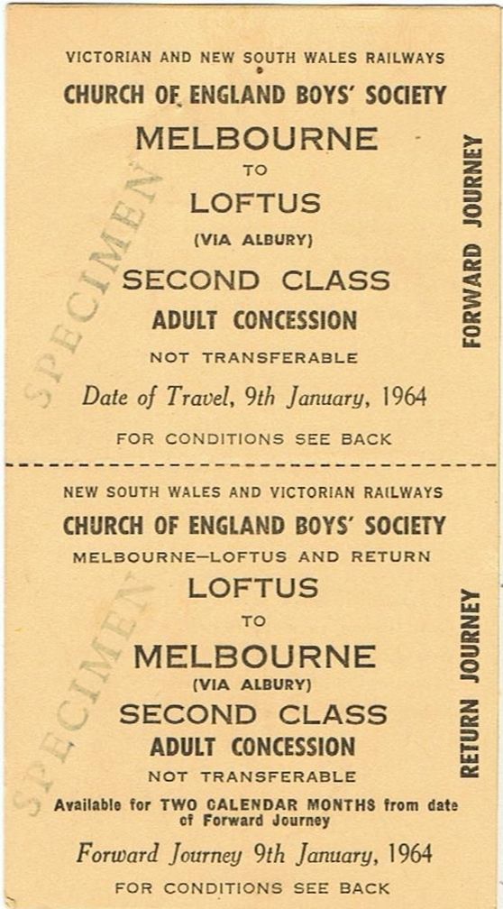 Railway ticket VR NSWGR Melbourne to Loftus C of E Boy''s society tour 1964