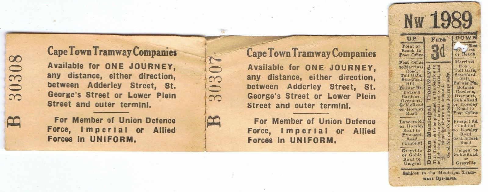 Railway Tramway tickets South Africa Durban Capetown Tramway companies WW2