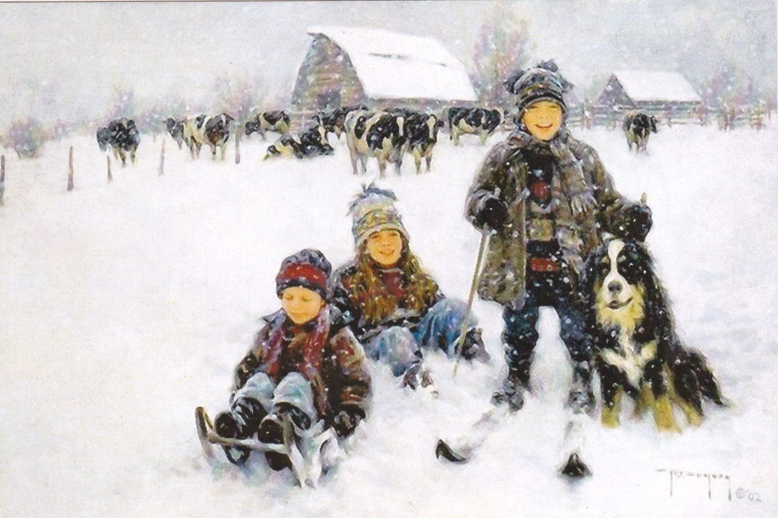Title (ebay affiliate link): RARE ROBERT DUNKAN Childen in winter skis sledges dog unposted modern postcard