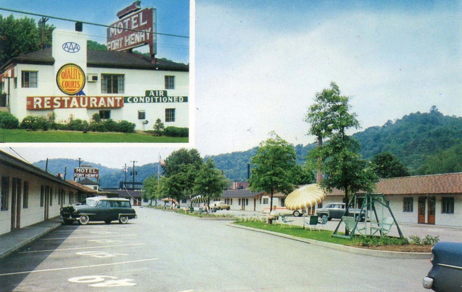 Wheeling WV, vintage postcard, Hotel Fort Henry & Restaurant, classic 50''s cars