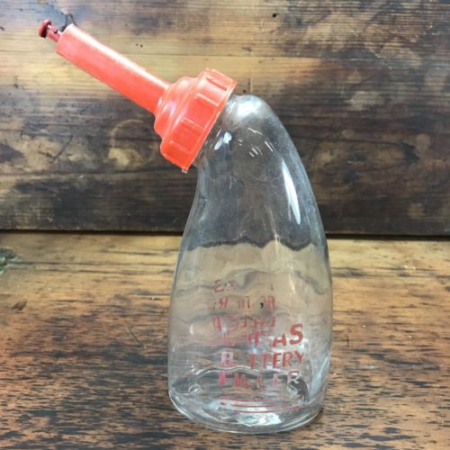 VINTAGE LUCAS BATTERY FILLER GLASS BOTTLE CLASSIC CAR KING OF THE ROAD OILER TIN