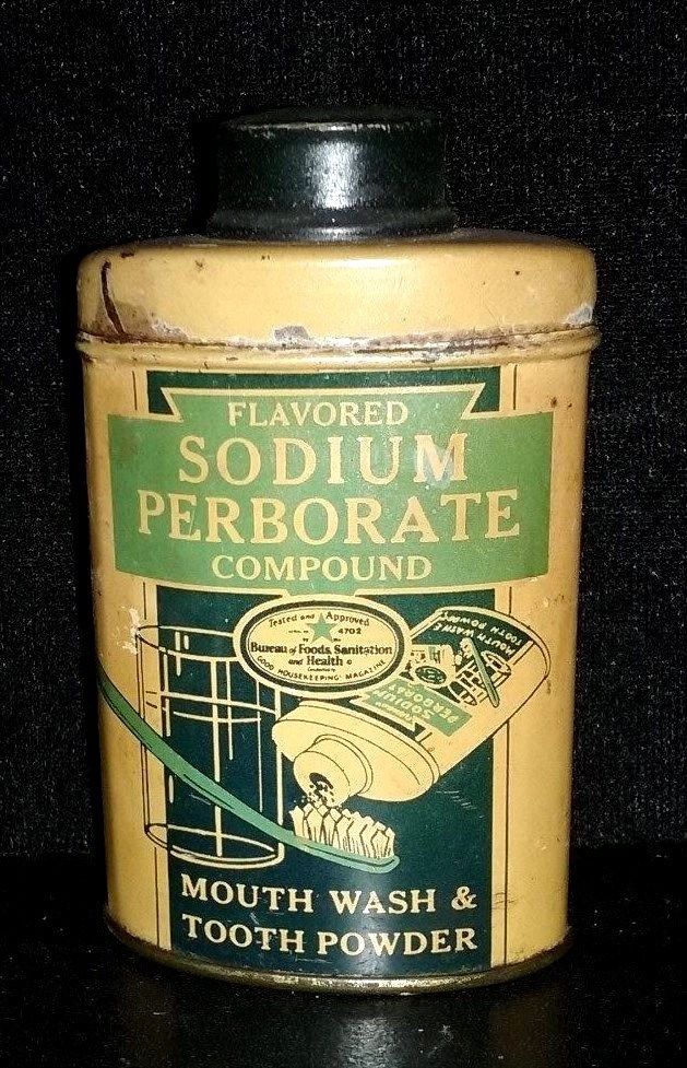 Title (ebay affiliate link): ANTIQUE VTG DENTAL TOOTH POWDER TIN:SODIUM PERBORATE GREAT GRAPHIC HEALTH BEAUTY
