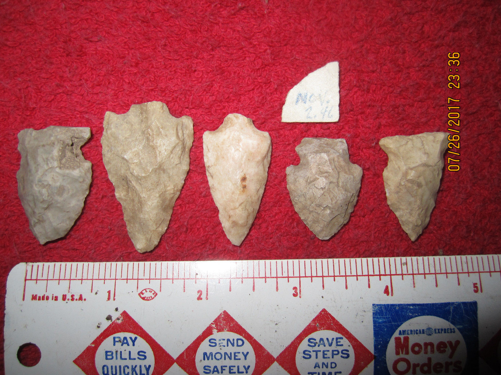 LOT OF 5 ASSORTED STYLE ARROWHEADS ( " SIDE HILL SITE ", MUD LAKE, WISCONSIN )