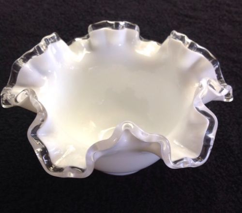 Title (ebay affiliate link): Vintage Milk Glass Fluted Candy Dish 7" Wide X 4" Tall Clear Glass Rim