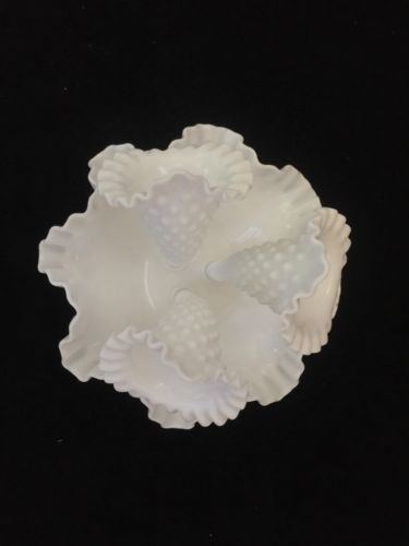 Title (ebay affiliate link): Vintage Milk Glass Epergne ~ White Hobnail 3-Horn Ruffled Cornucopia Centerpiece