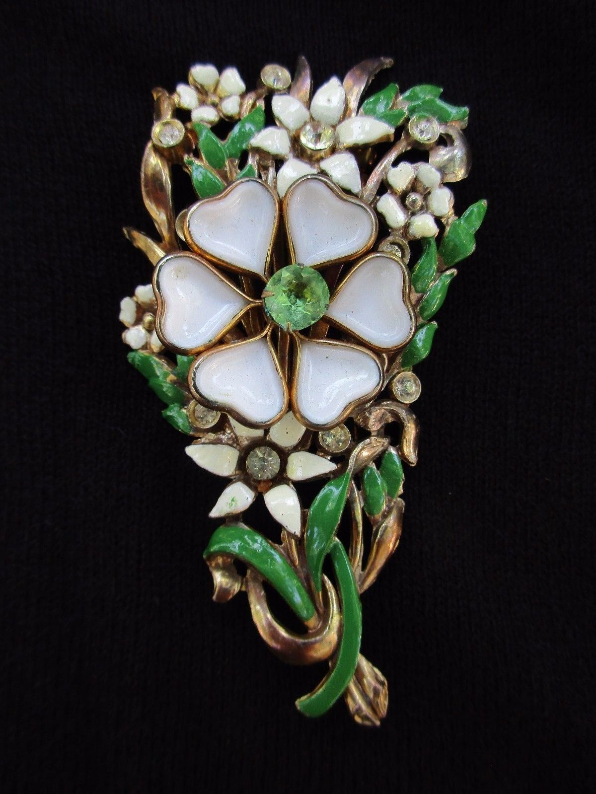 Title (ebay affiliate link): VINTAGE ART DECO Pot Metal Milk Glass Rhinestone Enamel FUR CLIP PIN Great Cond.