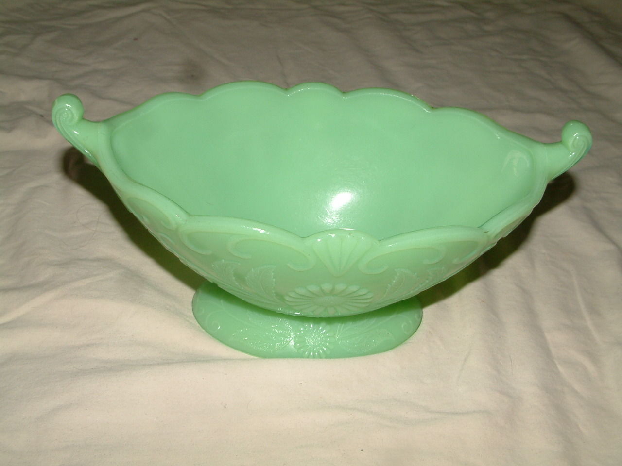Title (ebay affiliate link): Vintage Floral Embossed Jadite Console Center Piece Bowl Jade Green Milk Glass