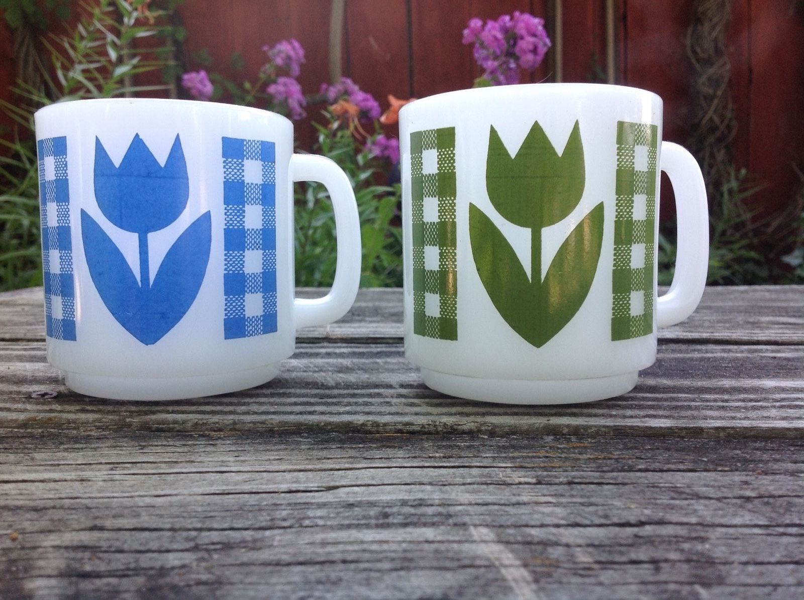 Title (ebay affiliate link): TWO VTG GLASBAKE MILK GLASS TULIP & GINGHAM COFFEE MUGS CUPS GREEN / BLUE