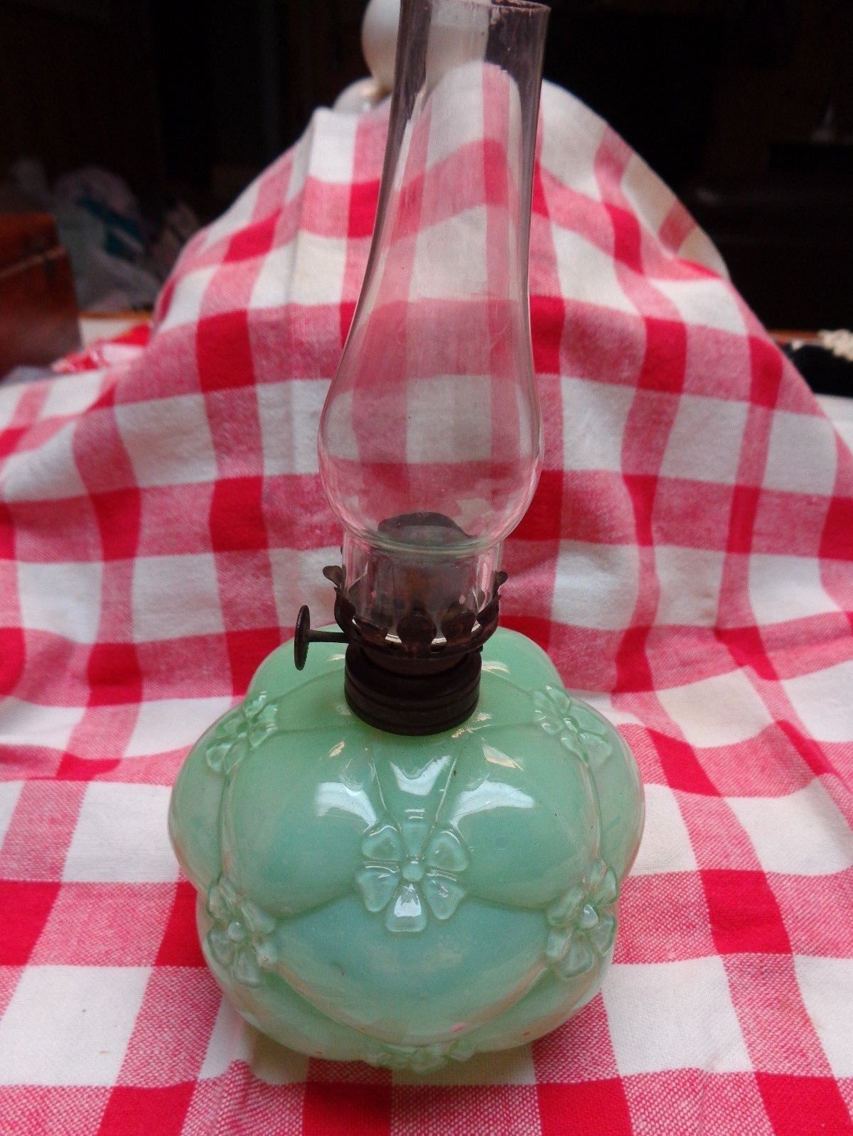 VINTAGE AQUA MILK GLASS MINITURE OIL LAMP NICE