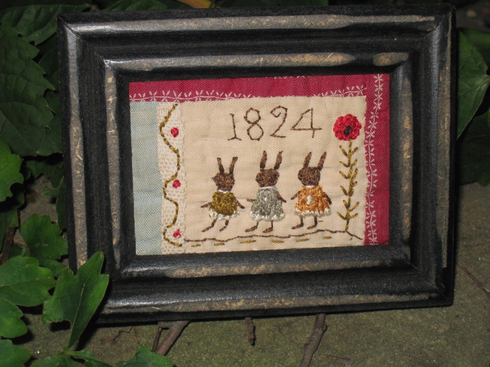 Title (ebay affiliate link): Primitive tiny Sampler on Antique Quilt~ 1824 Trio Folky Rabbits Walking~FolkArt