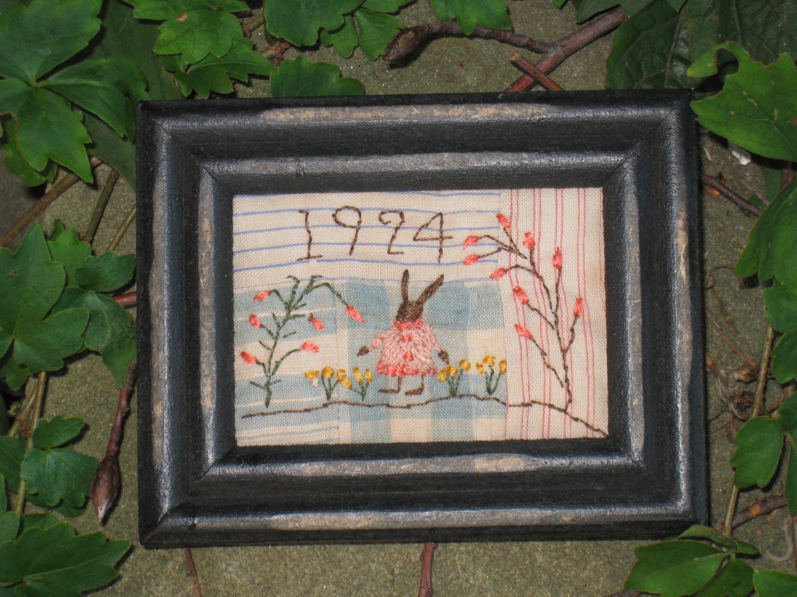 Title (ebay affiliate link): Primitive tiny Sampler on Antique Quilt~ 1924 Ms.Rabbit By Myself In The Garden