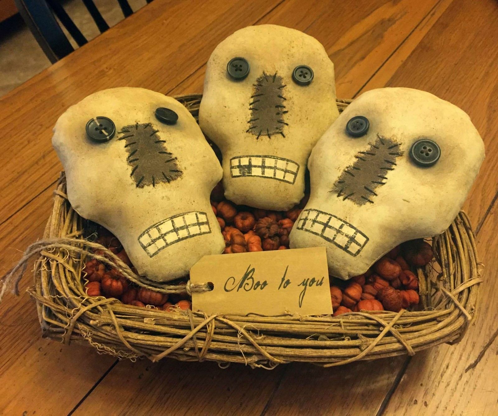 Title (ebay affiliate link): PRIMITIVE HALLOWEEN SKULL ORNIES, BOWL FILLERS, SET OF 3 HANDMADE