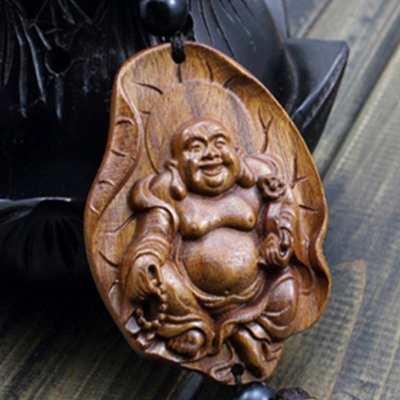 Title (ebay affiliate link): Wood Carved Laughing Maitreya Buddha Gift Folk Art Souvenir Mascot Lucky Pendant