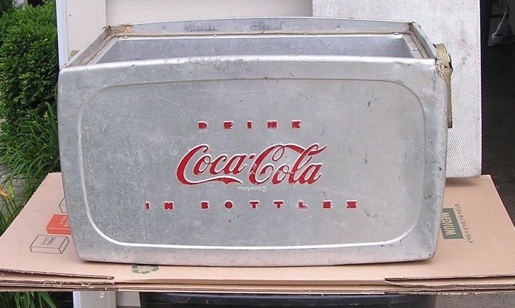 Title (ebay affiliate link): Vintage Aluminum Coca Cola Cooler - Drink Coca Cola in Bottles - See listing