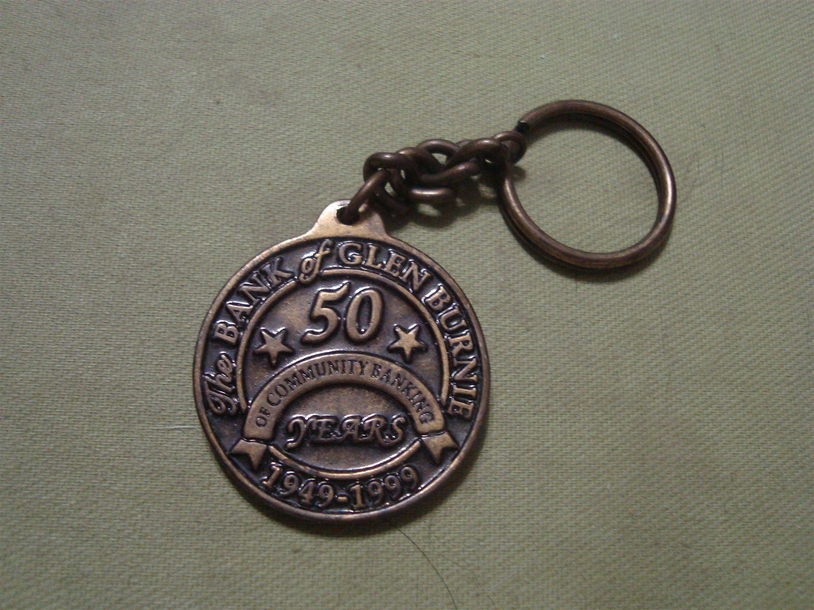 Title (ebay affiliate link): VINTAGE BANK OF GLEN BURNIE 50 YEAR 1949-1999 TOKEN MEDAL KEYCHAIN