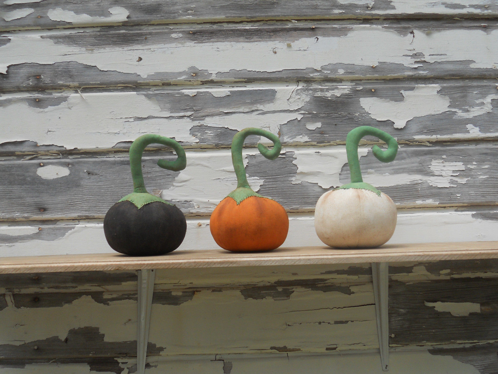 Title (ebay affiliate link): Primitive Halloween Orange Black White Large Pumpkin Trio Ornies Shelf Sitter