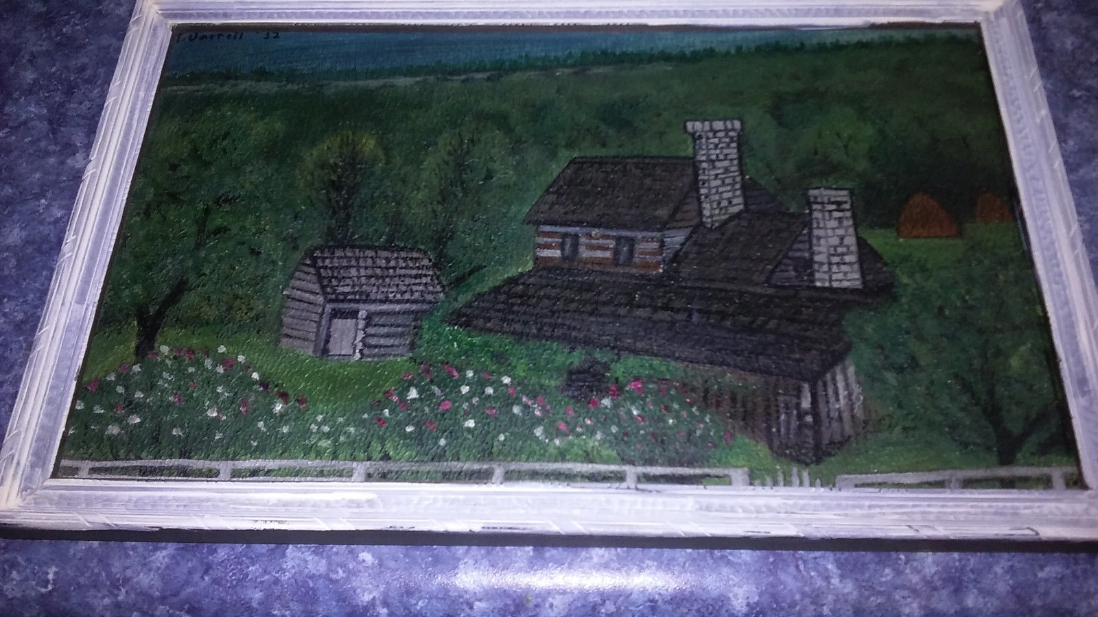 Title (ebay affiliate link): Early small Folk Art Oil on Board of Lovely Large Log Homestead in