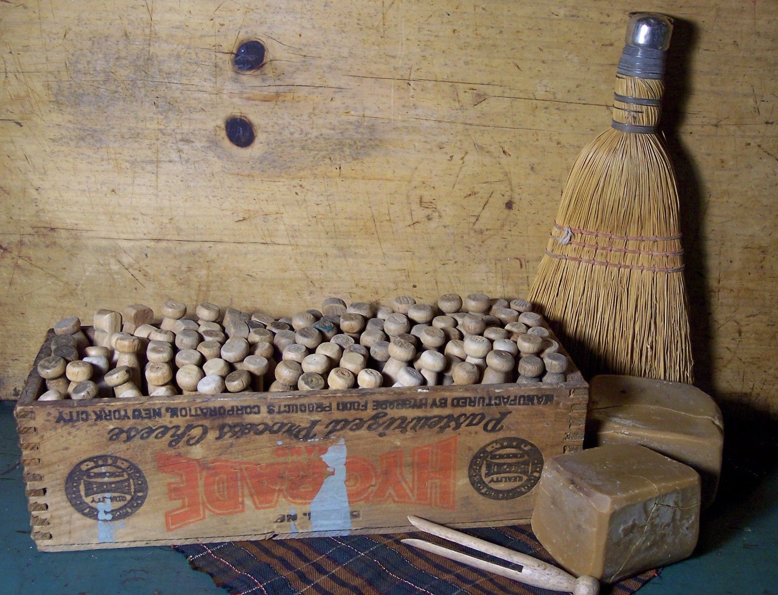vintage wooden clothespins cheese box lye soap whisk broom laundry room decor