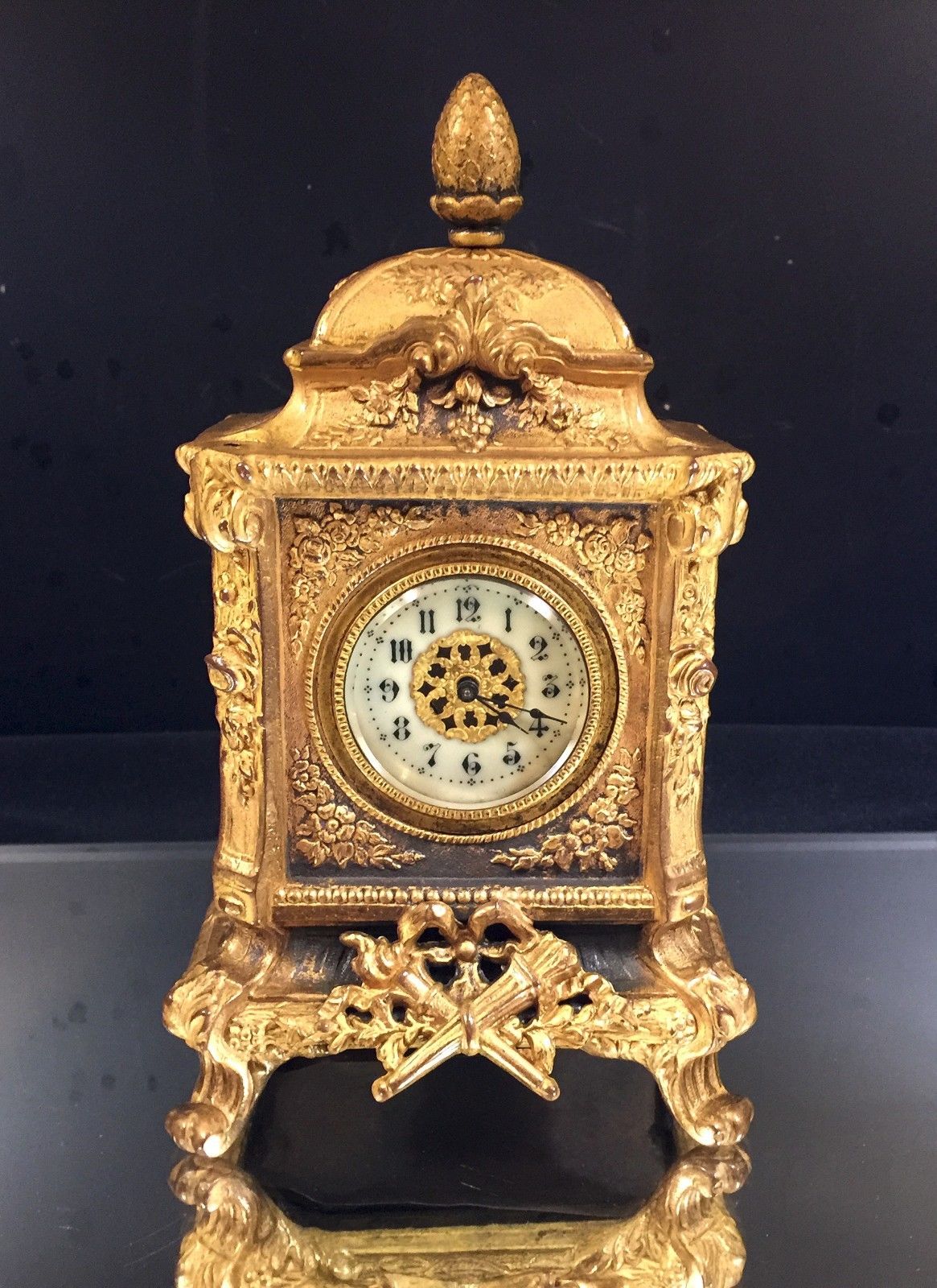 Title (ebay affiliate link): French Bronze / Gilt Alarm Clock--Lovely--Missing Finials--Working??--7-days