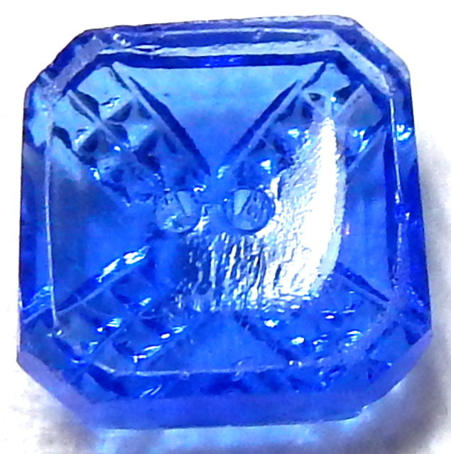 PRETTY SQUARE 1930''S TRANSPARENT BLUE DEPRESSION GLASS BUTTON w/CROSS PATTERN