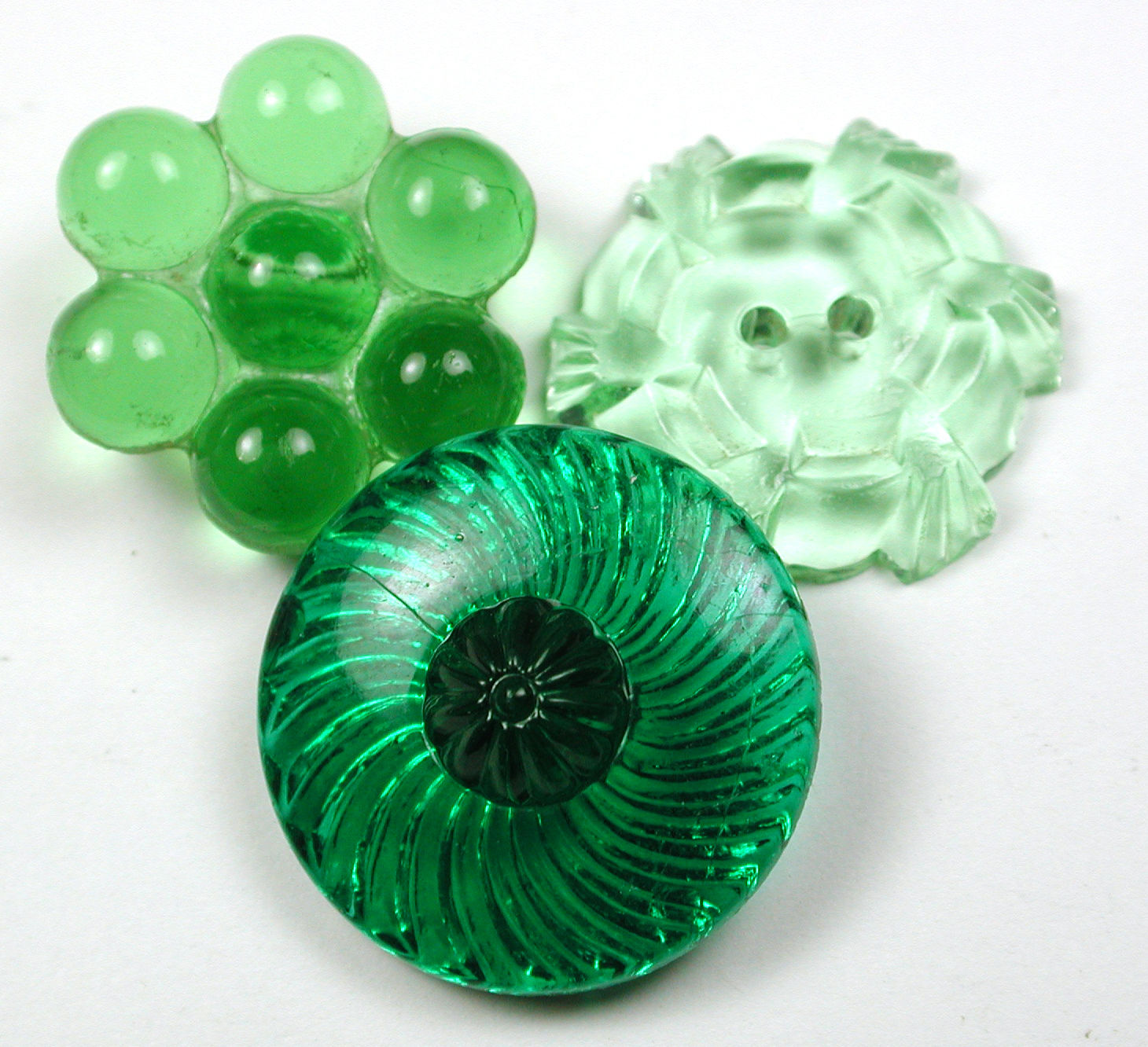 3 Vintage Depression Glass Buttons Various Green Designs - 7/8"