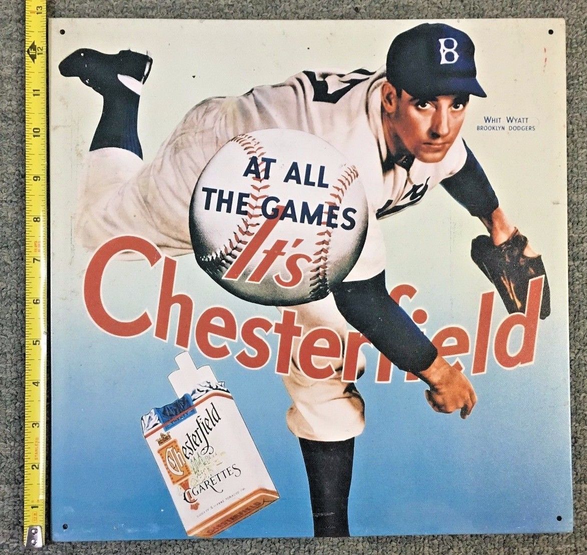 VINTAGE WHIT WYATT BROOKLYN DODGERS METAL PROMOTIONAL SIGN CHESTERFIELD CIGARETT