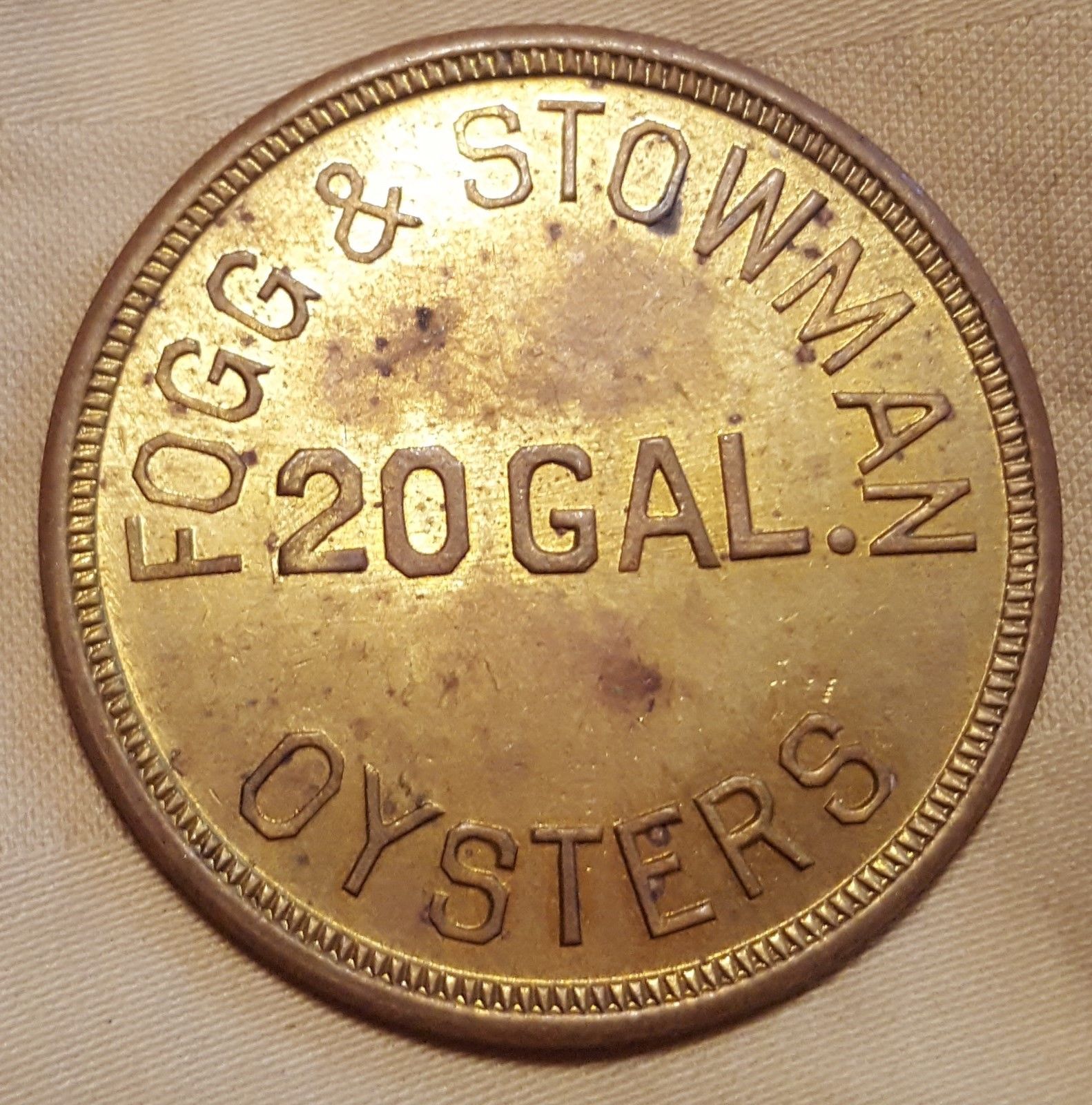 Oyster token Fogg & Stowman Oysters , Port Norris, NJ 20 Gal.