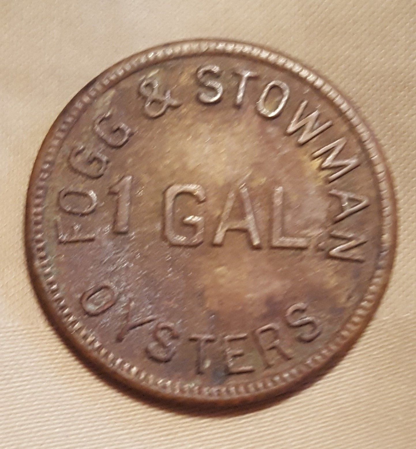 Oyster token Fogg & Stowman Oysters , Port Norris, NJ 1 Gal.