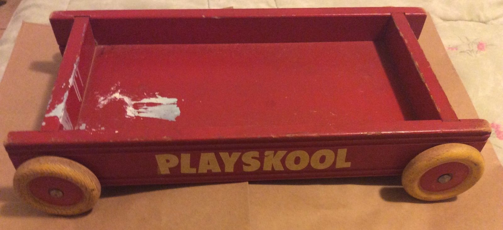 Title (ebay affiliate link): Vintage Playskool Wagon Red Pull String Toy Storage Wood Kids Toys