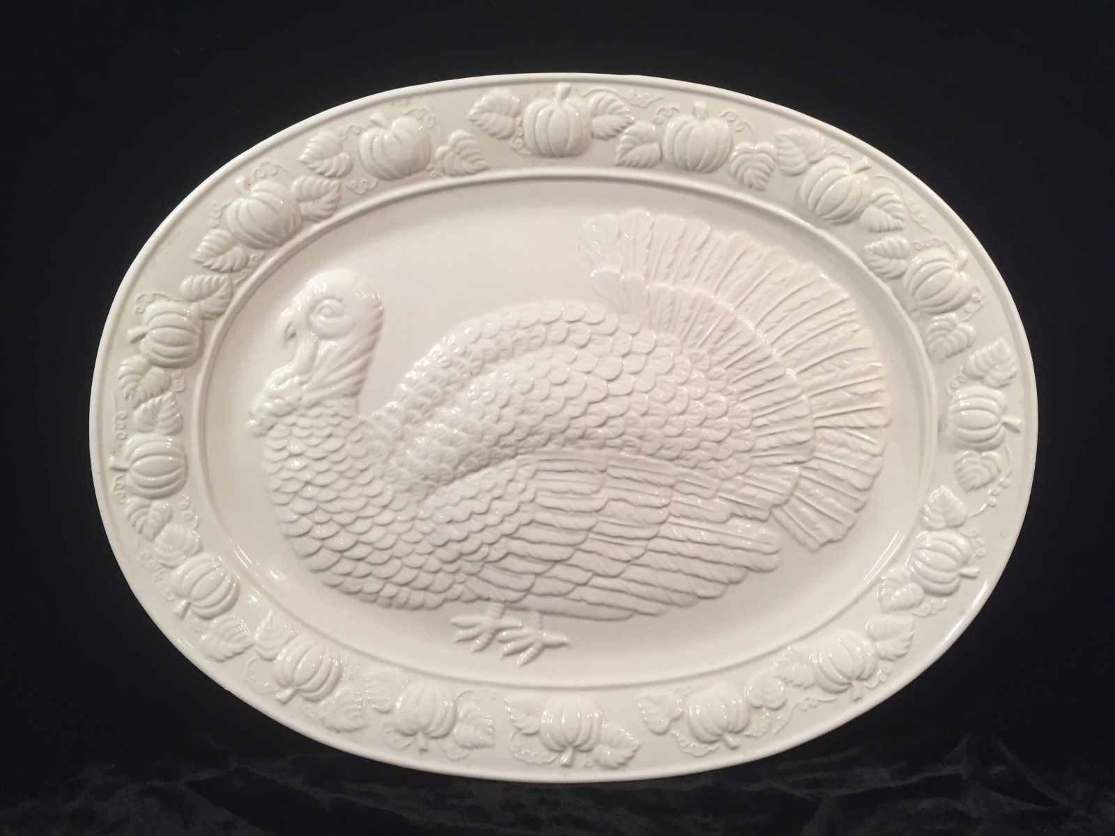 Title (ebay affiliate link): Large White Milk Glass Oval Turkey Platter w/Embossed Turkey & Pumpkin Border