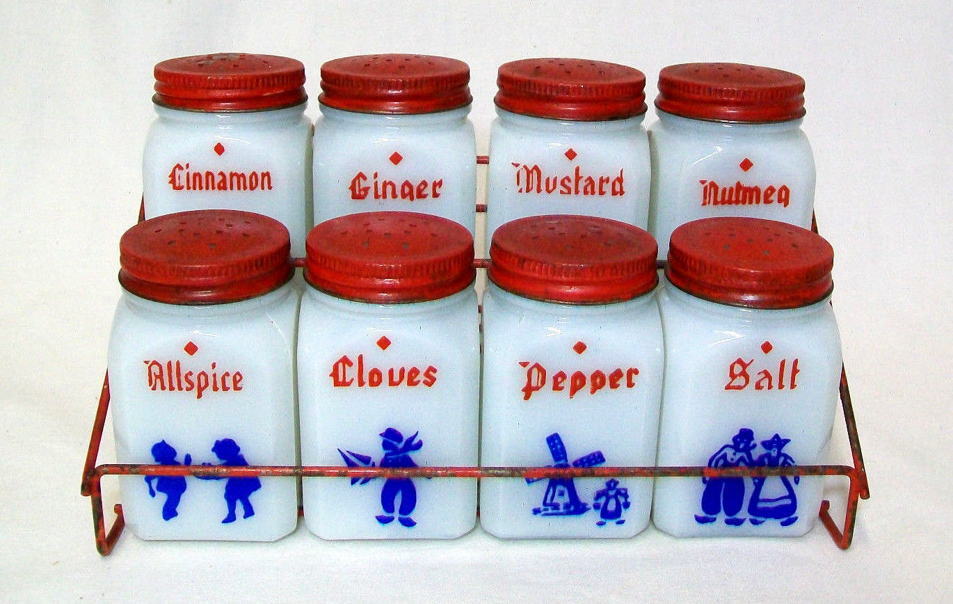 Title (ebay affiliate link): Vintage Frank Tea & Spice Co. Milk Glass Dutch 8 Spice Jars & Rack GVC