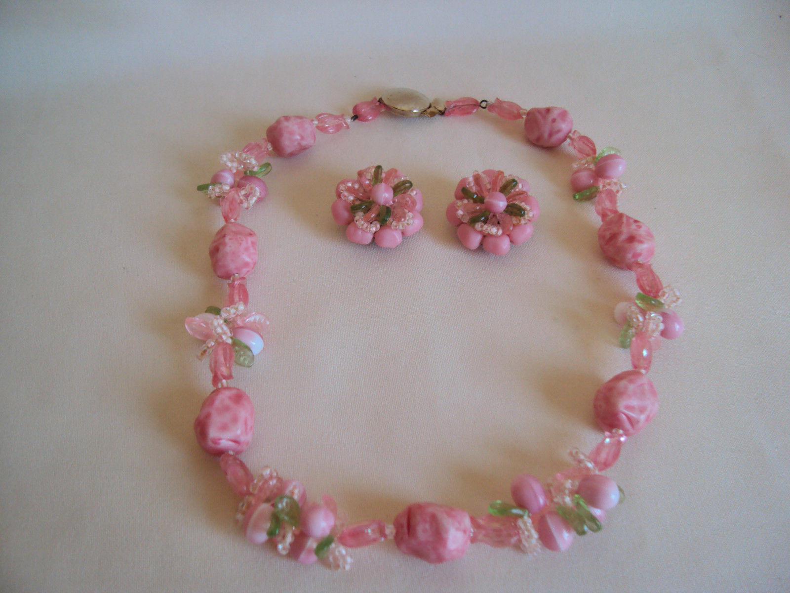 Title (ebay affiliate link): VINTAGE PINK MILK GLASS & PLASTIC NECKLACE & EARRINGS SET W. GERMANY MADE SIGNED