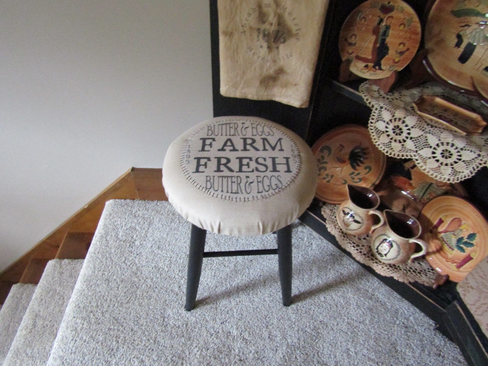 Title (ebay affiliate link): PRIMITIVE FARMHOUSE STOOL WITH "BUTTER & EGGS-FARM FRESH" COVER