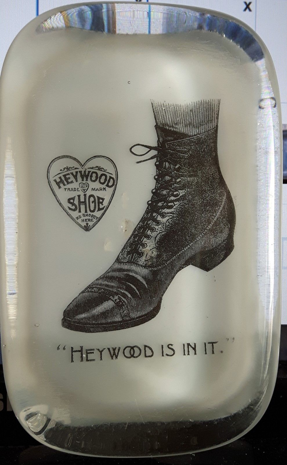 Title (ebay affiliate link): ANTIQUE MILK GLASS BACK BARNES & ABRAMS NY ADVERTISING PAPERWEIGHT HEYWOOD SHOES