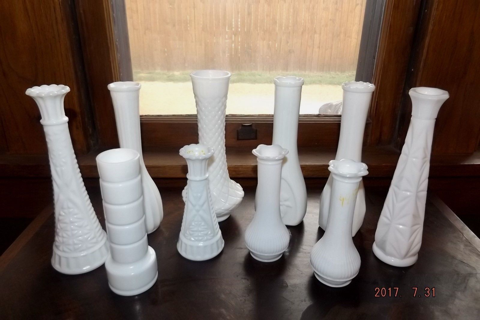 Title (ebay affiliate link): Lot Of 10 Milk Glass Vases, Mixed Patterns & Sizes, Wedding/Shower/Florist