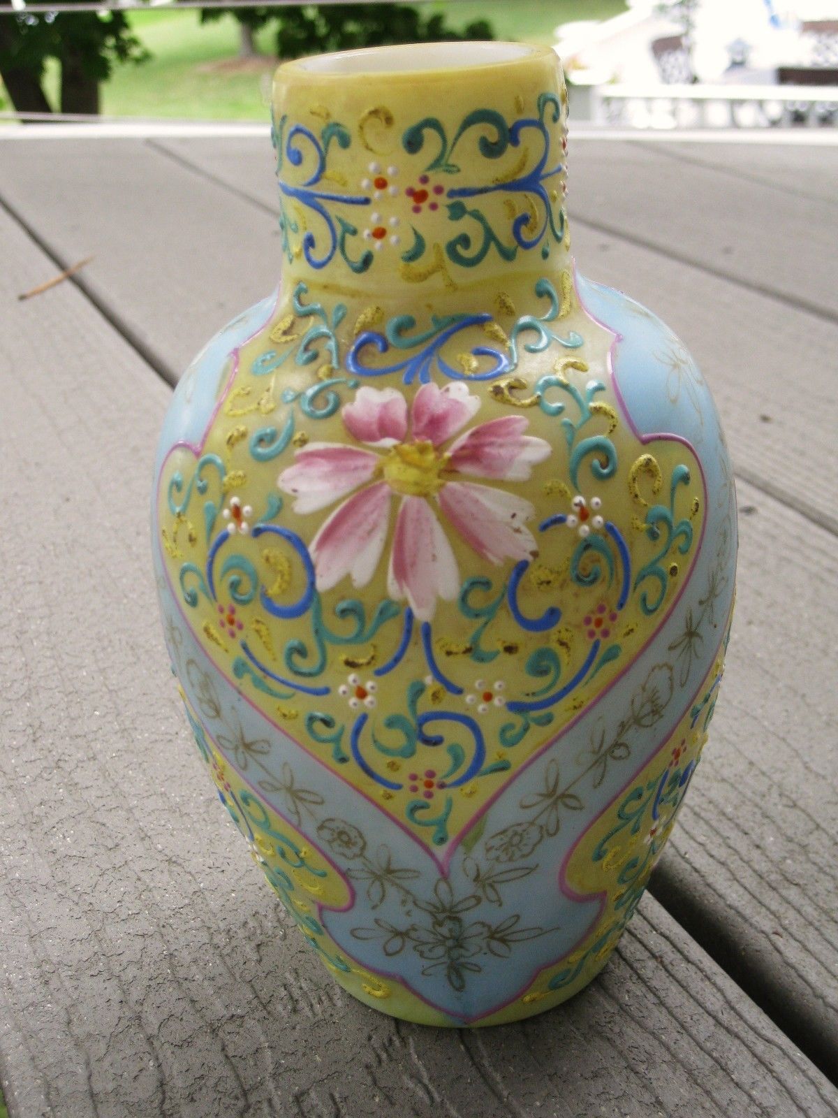 Title (ebay affiliate link): Antique Vintage Milk Glass Hand Painted Moriage Vase 7" x 3 1/2"