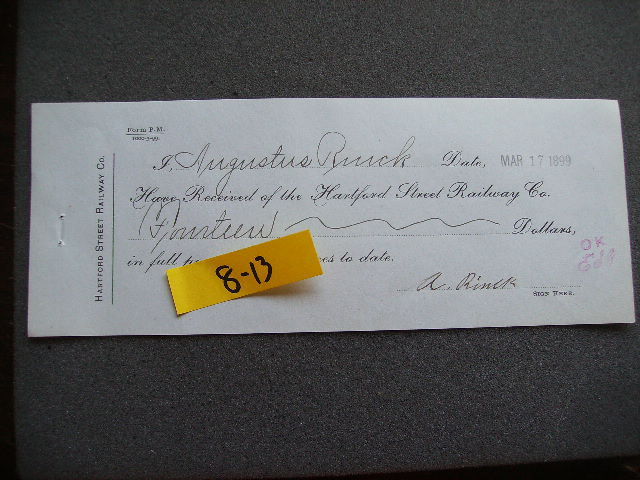 HARTFORD STREET RAILWAY 1899 RECEIPT LOT 8-13
