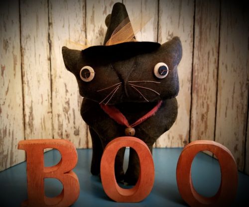 Title (ebay affiliate link): Primitive Standing Black Cat Doll w/ Wooden Letters BOO ~*~ Kitty~*~Fall~*~