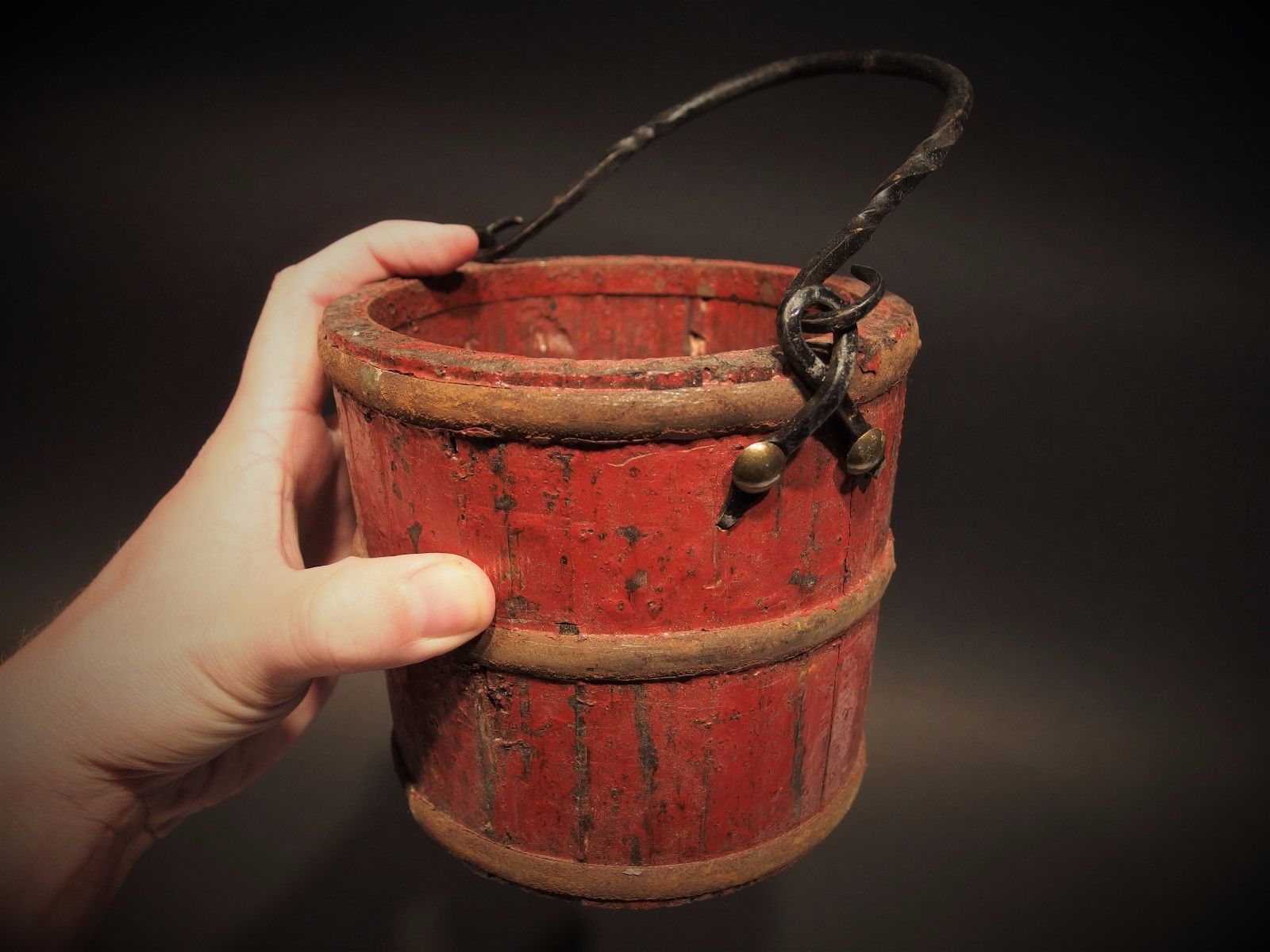 Title (ebay affiliate link): Primitive Antique Style Colonial Wood Berry Bucket w Iron Handle old Red Paint