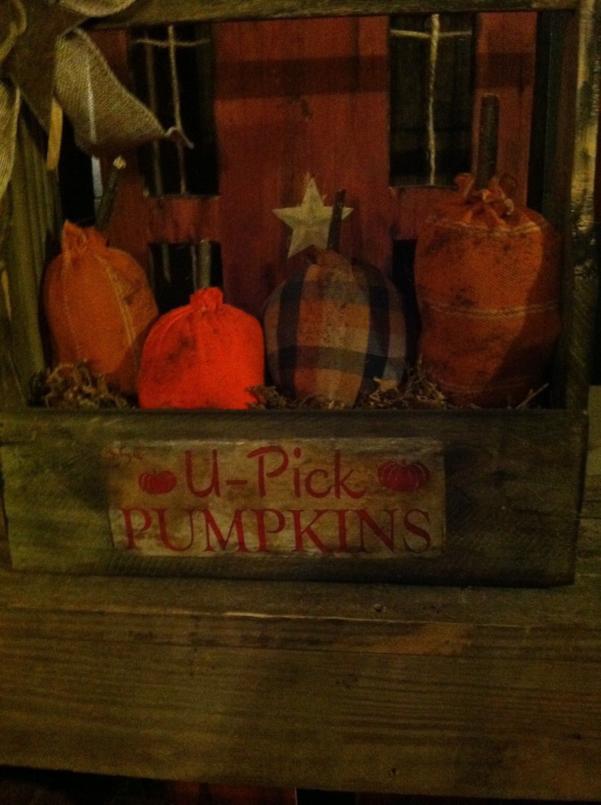 PRIMITIVE HALLOWEEN FALL PUMPKIN ORNIES IN A WOODEN TOOLBOX DECOR