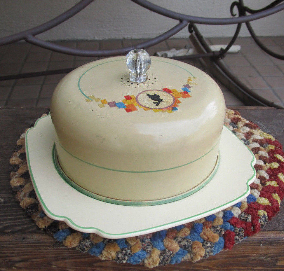 Title (ebay affiliate link): VINTAGE 1935 ART DECO YELLOW CHEESE/CAKE KEEPER~TIN DOME COVER w/GLASS KNOB