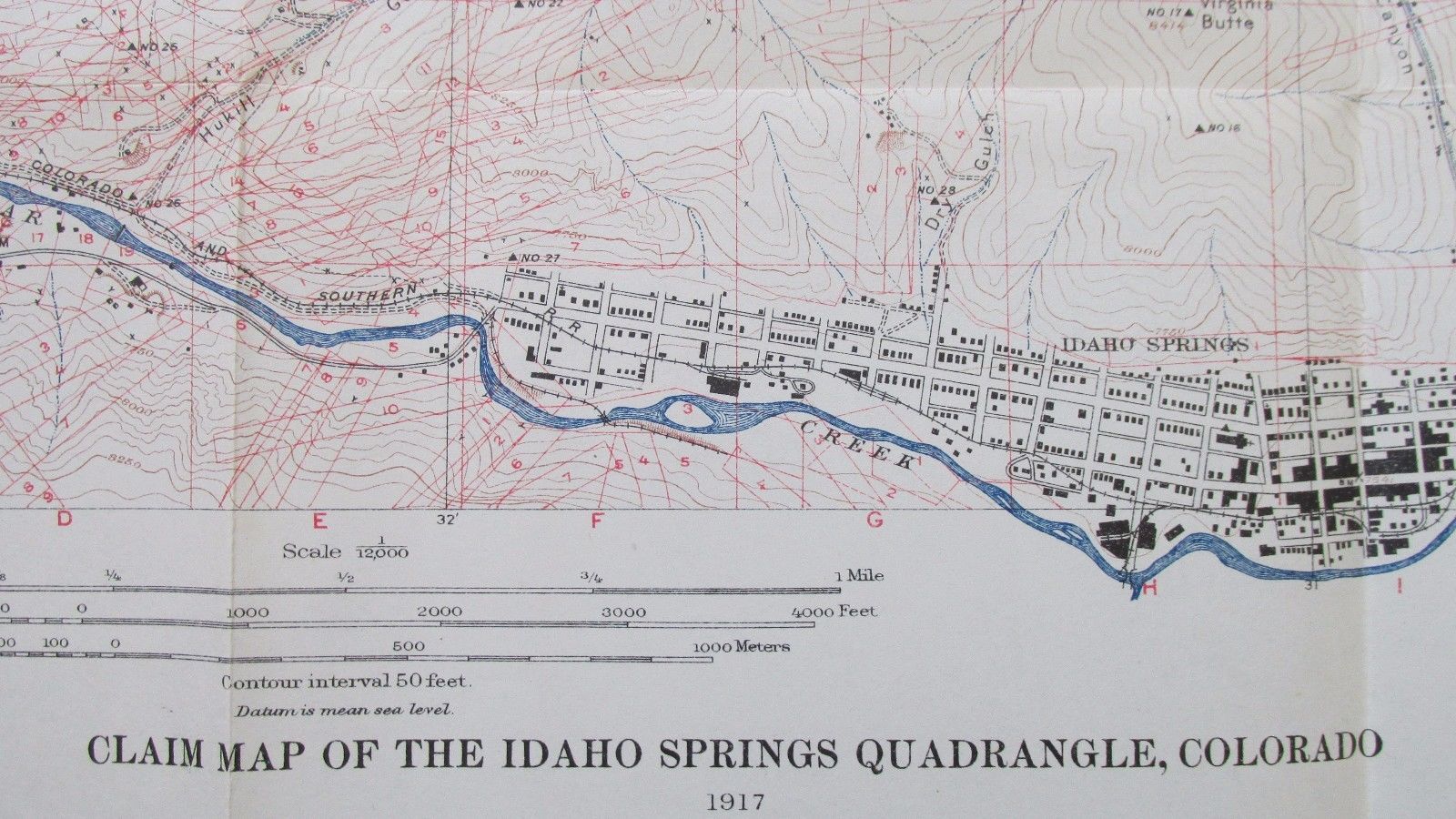 Title (ebay affiliate link): 1917 Mine Claim Map Idaho Springs Colorado Quadrangle-Railroad Lines & Mines