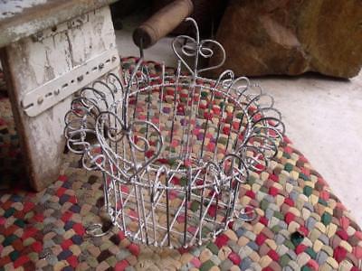 Primitive Vintage Tin Wire Wireware Basket Wood Handle Shabby White Hearts