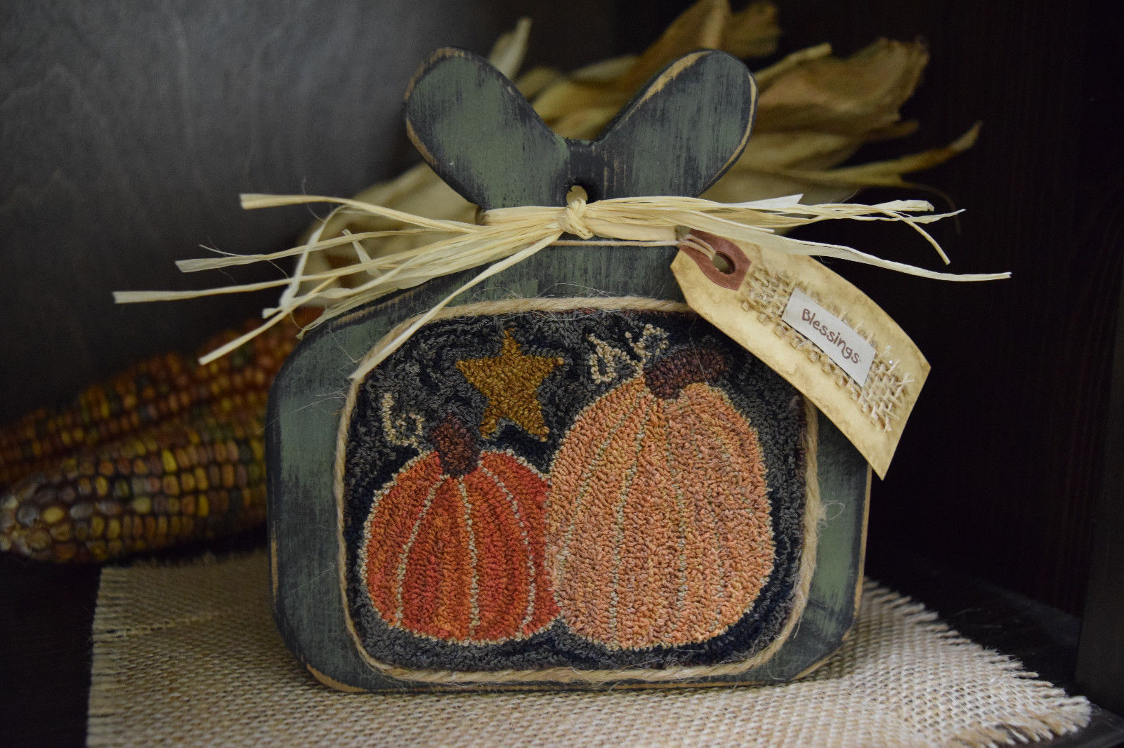 Primitive Punch Needle Pumpkin Duo Hornbook Star Autumn Thanksgiving Fall 6" H
