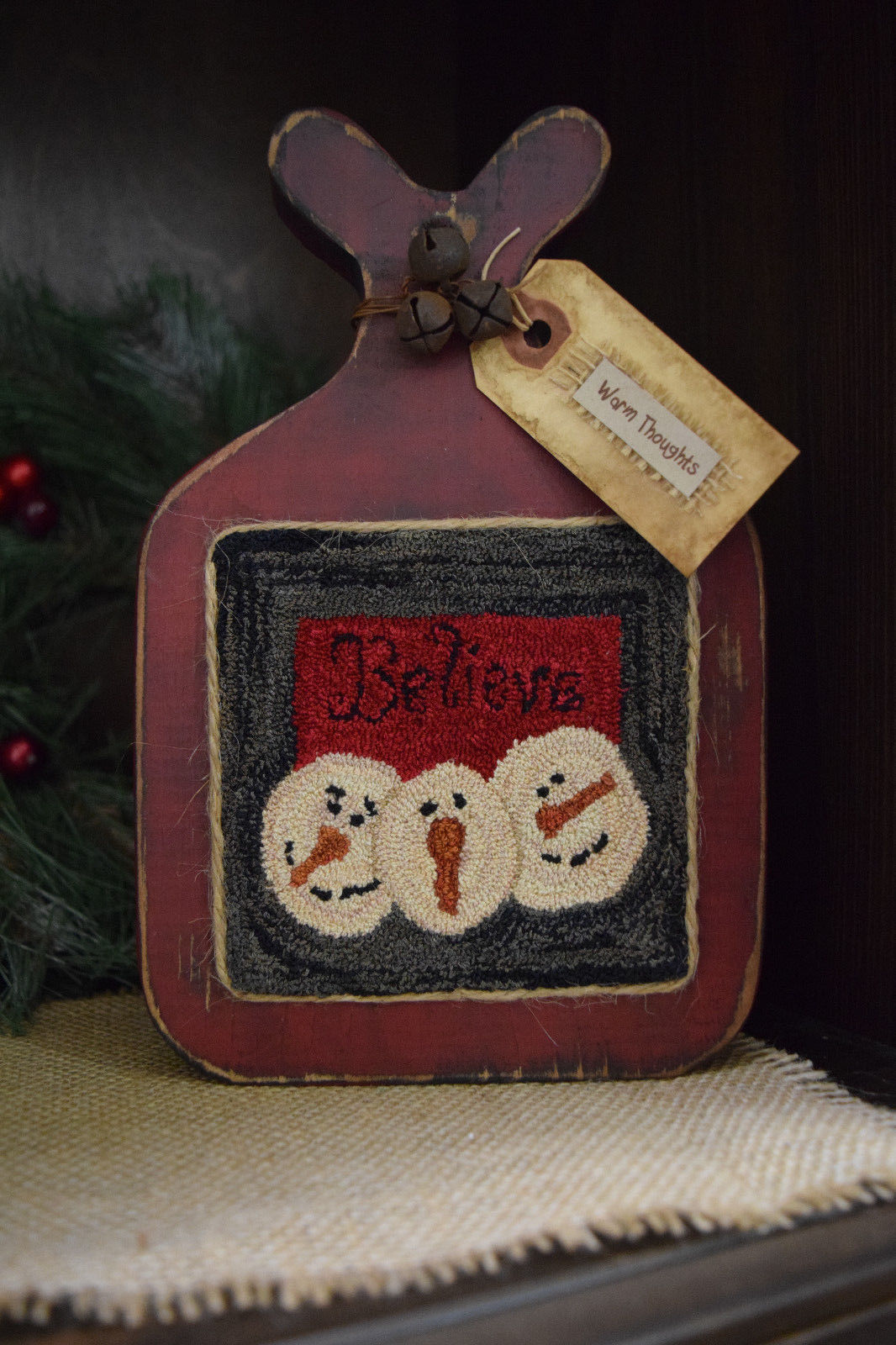 Title (ebay affiliate link): Primitive Punch Needle Winter Christmas Snowman Trio Hornbook Rusty Bells 8.5"H